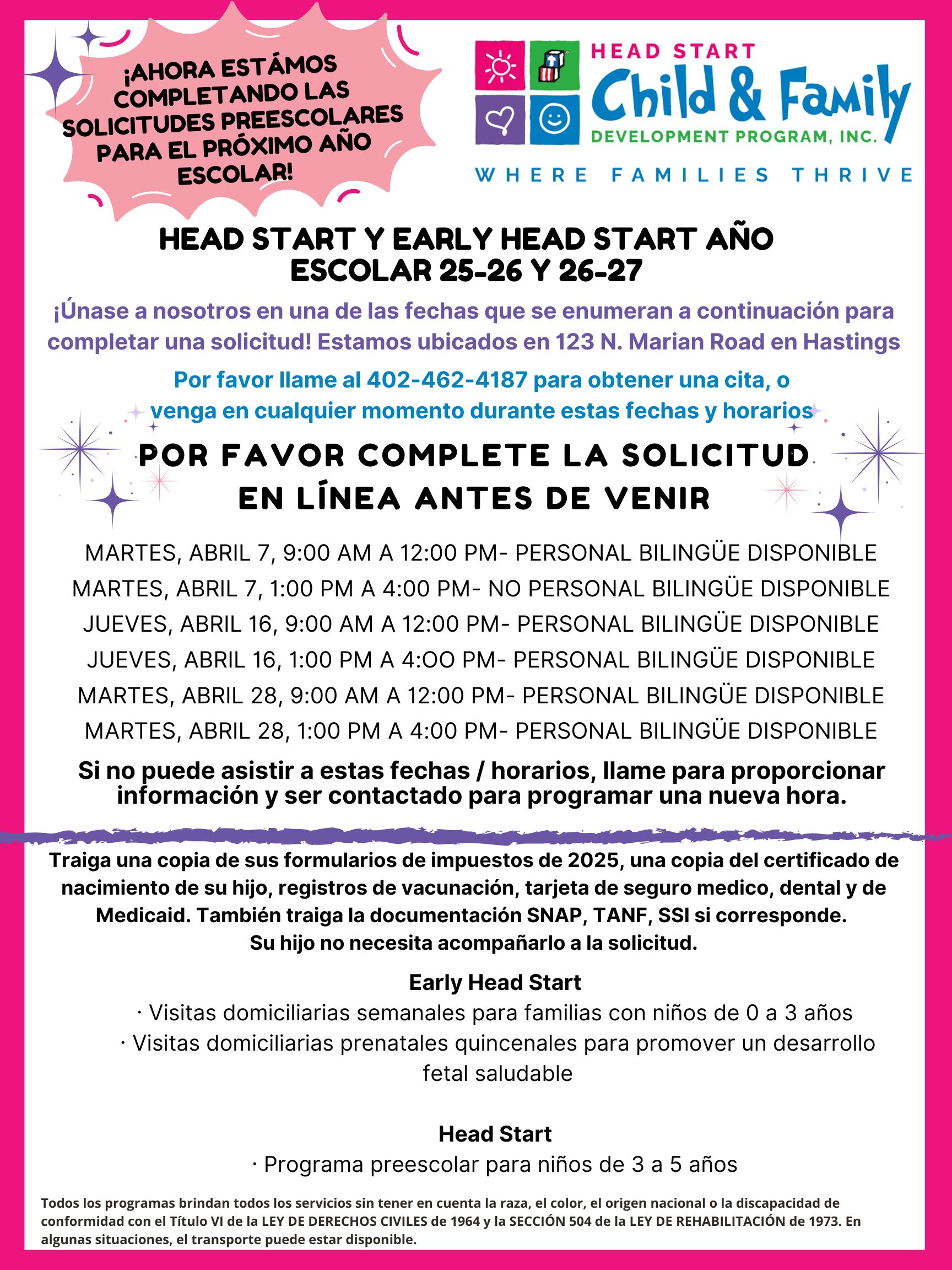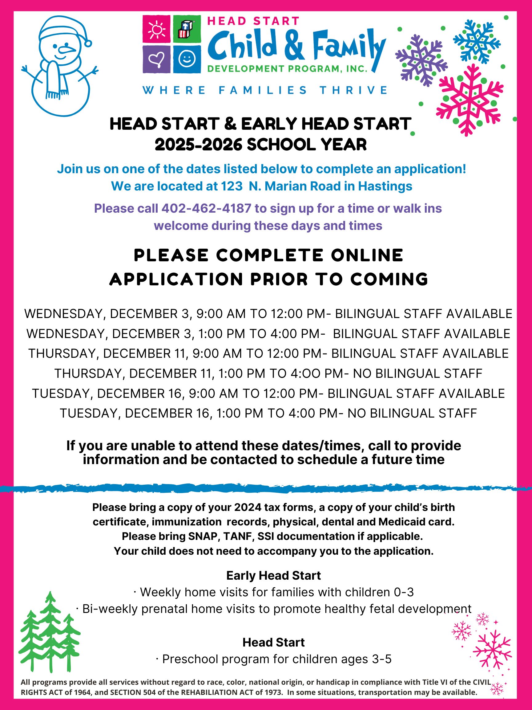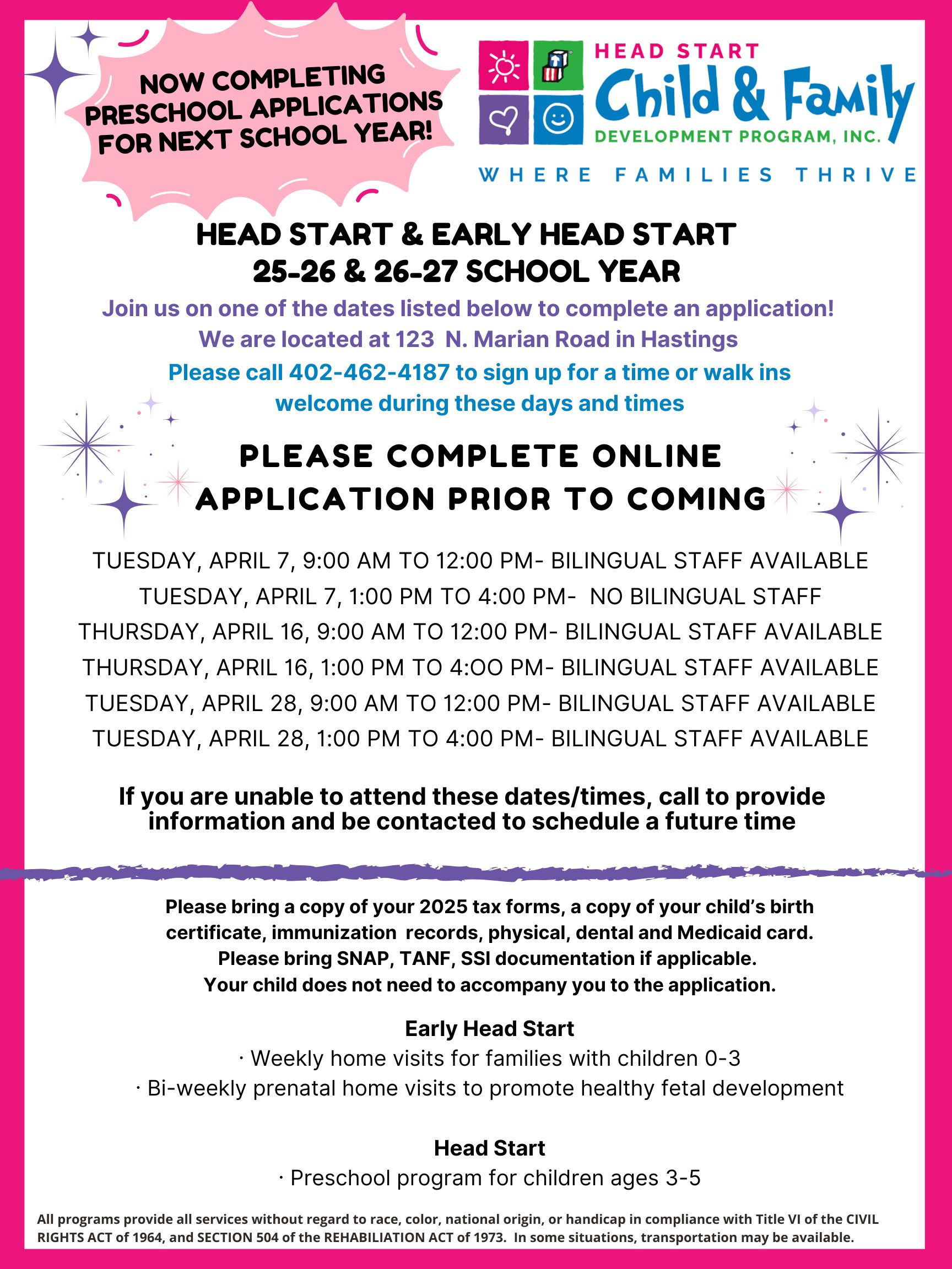 Come see us at our Hastings location to complete an application for your preschool children ages 3-5! You can also fill out an Early Head Start application for prenatal moms and children ages birth-3. We would love to meet your family and start the process of giving your child a Head Start! ![]()